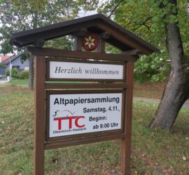 Am 4. November findet unsere nächste Altpapiersammlung zugunsten unserer Jugendarbeit statt. Ab 9:00Uhr werden die helfenden Hände des TTC das am Straßenrand abgelegte Papier mitnehmen. Zur besseren Information der Hasler Einwohner und fleißigen Papiersammler hat der TTC entsprechende Hinweistafeln für die Ortseingänge gestaltet.