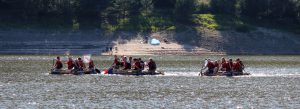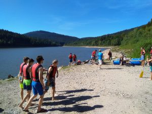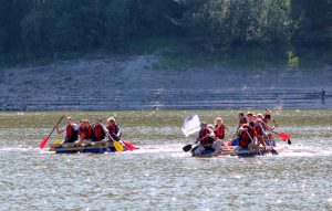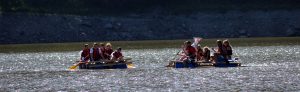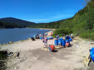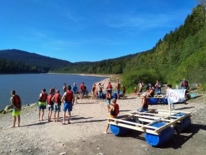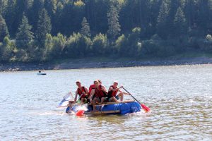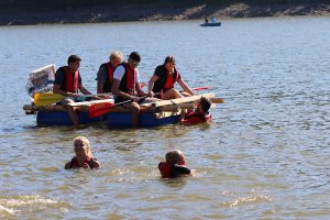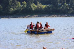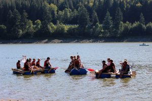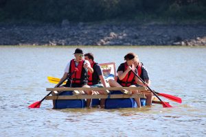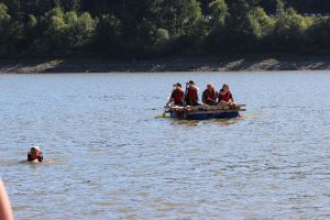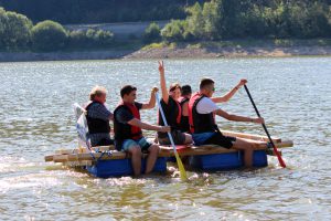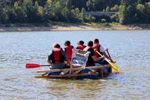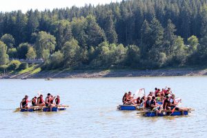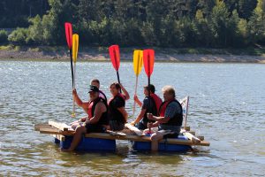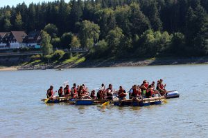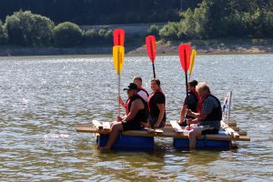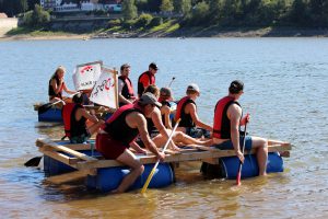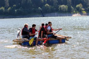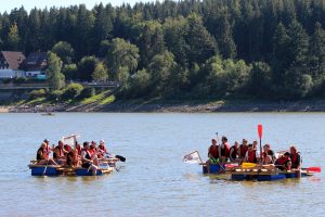 Für die Teilnehmer bedeutete das neben der Herausforderung „Floßbau“ auch eine gehörige Portion Spaß und Nervenkitzel. Bei herrlichem Spätsommerwetter und Temperaturen um 30°C hätte ein nicht geplantes Kentern eine willkommene Abkühlung bedeutet. Alle vier Teams konnten ihr Floss jedoch erfolgreich durch den TÜV bringen und auch erfolgreich am geplanten Rennen von der Mitte der Schwarzenbachtalsperre aus starten.