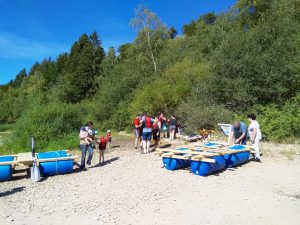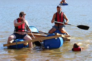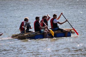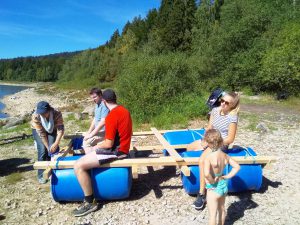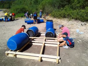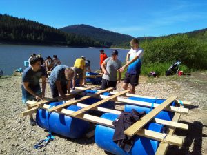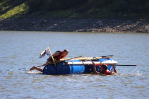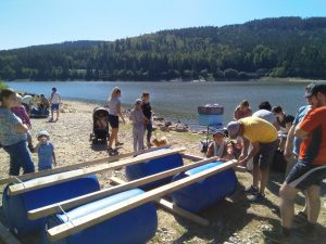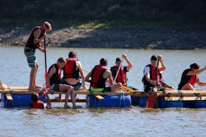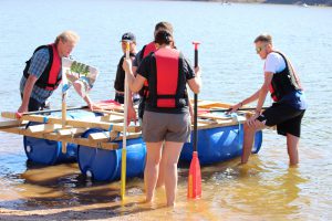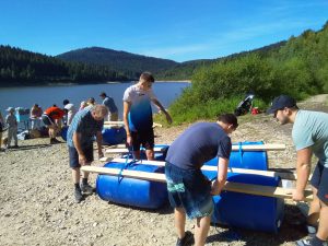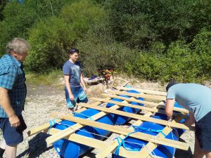In der folgenden Stunde ging der Bauplan in die Fertigung. Gemeinsam wurden in jedem Team die Fässer, lange Kanthölzer, kurze Kanthölzer, einige Bretter, kurze und lange Seile und Gurte zu einem Floss zusammengefügt. Nach Ablauf der Bauzeit wurden die Flöße von Daniel und Philipp überprüft und abgenommen, bevor Sie zu Wasser gelassen wurden. Nach den zweifelhaften Blicken von den Teamtrainern und dem verteilen von Schwimmwesten, erhielten jedoch alle Flöße „Grünes Licht“ und freie Fahrt für die Floßtaufe.