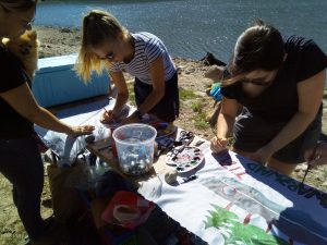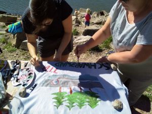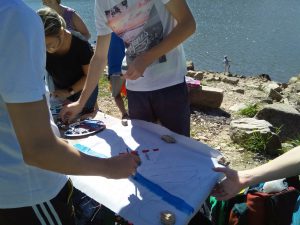 Die Vereinsmitglieder, die sich dieser Aufgabe stellten, wurden in vier Gruppen mit ca. 7 Personen aufgeteilt. Auch die Kinder wurden in die Gruppen aufgenommen. Nach der Einweisung in den Bau der Flöße durch Daniel und Philipp von „Blackforestaction“, wurden wir mit dem nötigen Material hierfür ausgestattet. Gemeinsam musste in jeder Gruppe ein Plan erstellt werden, wie das Floß zusammengebaut werden soll. Dafür hatten wir ca. eine Stunde Zeit – hierbei waren schon Kooperation und Teamwork gefragt. Da teilweise die gezeichneten Pläne schon abenteuerlich aussahen, war der Nervenkitzel um die spätere Funktionstüchtigkeit der Flöße schon gegeben. An einer Kreativstation erstellte jedes Team eine eigene Piratenflagge, die bevor die Flöße ins Wasser gelassen werden, gehisst wird. Die vier Teams des TTC Oberkirch-Haslach starteten unter den Flaggen „Titanic“, „KoBra“, „Black Pearl“ und „Schwarzwald-Titanic“