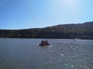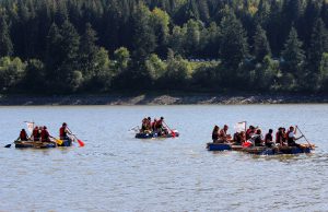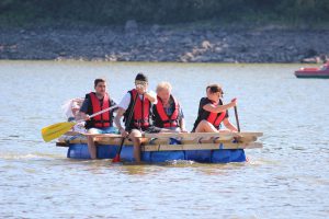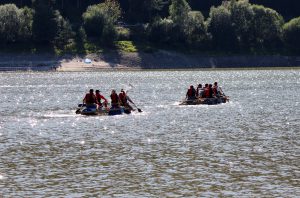 Dann wurde es spannend: Es folgt nämlich das große Bootsrennen auf dem See. Auf dem Weg zur Mitte der Schwarzenbachtalsperre wurden zuerst die Eigenschaften und die Wendigkeit der Flöße vom jeweiligen Team getestet. Dabei zeigten sich schon Unterschiede bei den einzelnen Flößen. Vor allem die Gewichtsverteilung auf den einzelnen Sitzplätzen der Flöße führte zu Schwierigkeiten beim Gerade-ausfahren. Die etwas „stärkeren“ Matrosen lagen etwas tiefer im Wasser und schenkten den „Leichtmatrosen“ dadurch erhöhte Sitzplätze. Aber jedes Team konnte die Schwierigkeiten meistern. Alle vier Flöße erreichten die Startlinie in der Mitte der Schwarzenbachtalsperre. Nach dem Startschuss bzw. Steinwurf von Daniel, schossen die Flöße von der Startlinie in Richtung Ufer – dem Ziel des Rennens – davon. Die Ideallinie zum Ziel – wegen des Gegenwindes natürlich – wurden von allen Flößen mehrmals gekreuzt. Sieger beim Rennen wurde das Team „Black Pearl“. Gewonnen haben jedoch alle Teilnehmer bei diesem Familientag. Die Freude, Spannung und der Nervenkitzel war auch bei den Kleinsten zu sehen und spürbar.