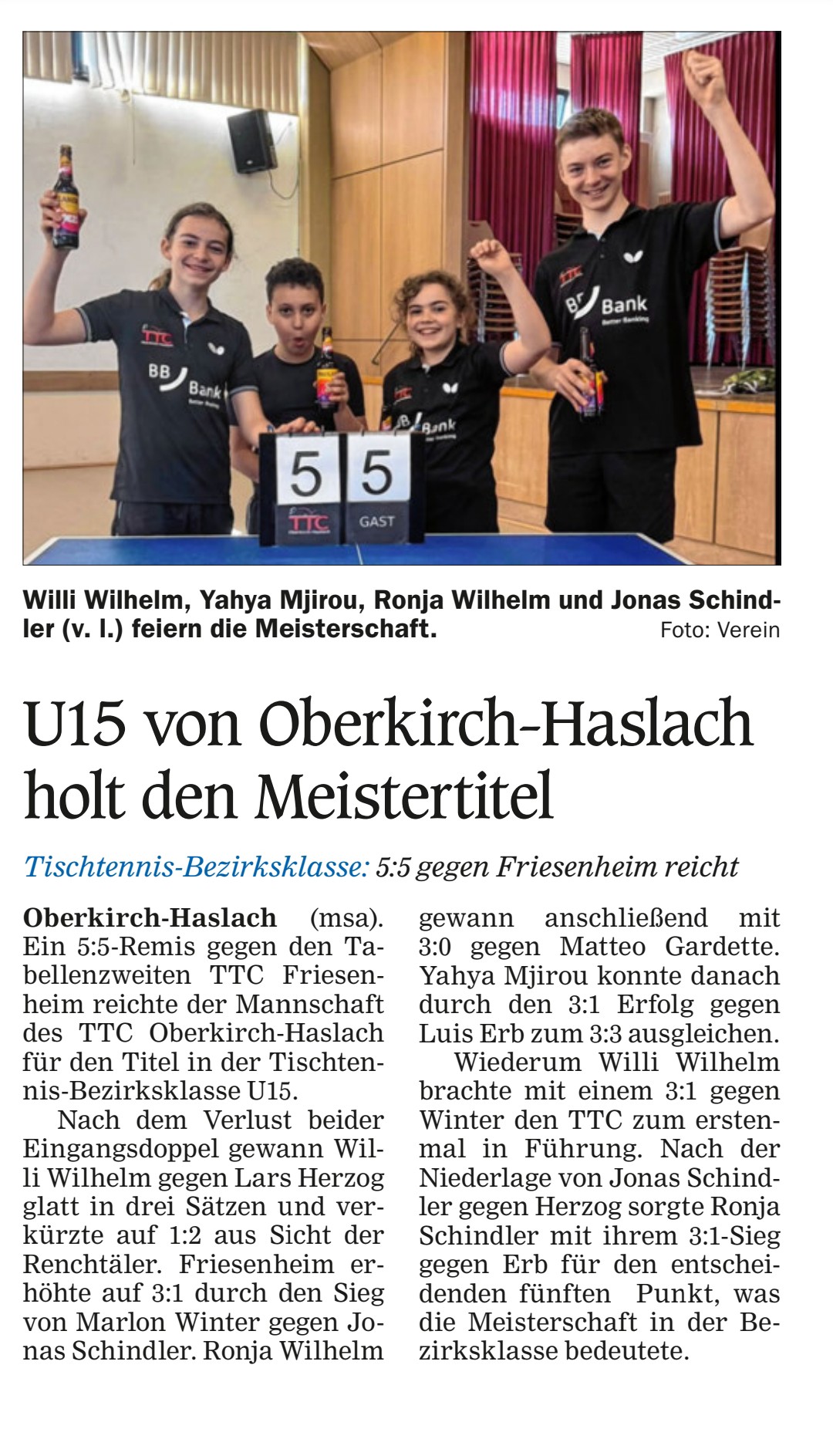 11.10.2025 Unsere Spielerinnen und Spieler der Jugendmannschaft traten in verschiedenen Altersklassen bei Jugendbezirksmeisterschaft in Nonnenweier an. Jonas Schindler und Willi Wilhelm traten in der Klasse Jungen 15, Ronja Wilhelm in der Klasse Mädchen 13 und Yahya Mjirou in der Klasse Jungen 11 an.
