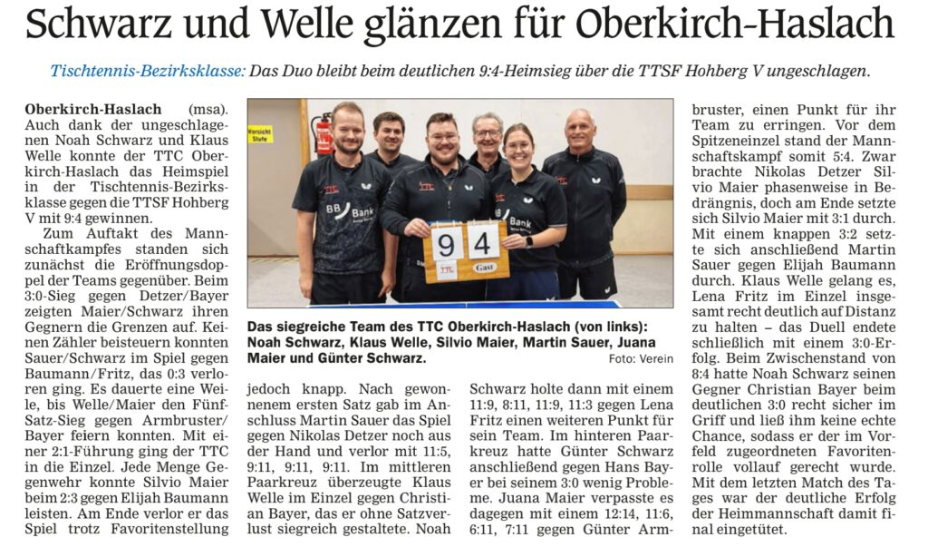 21.03.2025 Die zweite Herrenmannschaft schlug die Gäste aus Elgersweier deutlich mit 9:4. Damit bestätigen die Hasler ihre tolle Form und verteidigen Tabellenplatz 4.