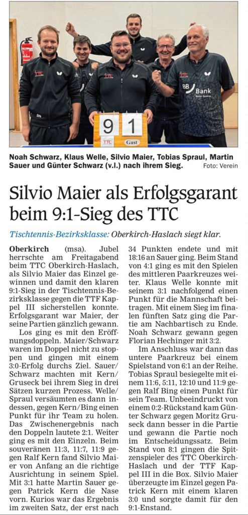 Große Begeisterung herrschte am Samstagabend beim Heimteam vom TTC Oberkirch-Haslach II, als Andreas Huber sein Einzel gewinnen und damit den 9:4-Sieg gegen die Gäste des TTC Berghaupten II sicherstellen konnte.